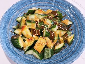 Spice Level: 1/3. 【Can't be GF】Chilled English cucumber salad with fragrant chili sesame dressing.