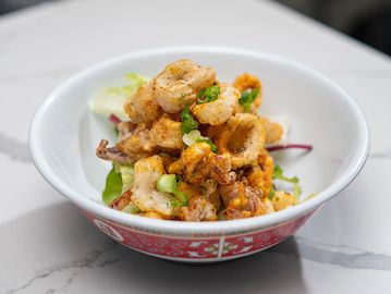 Spice Level: 1/3. 【Can't be GF】Crispy tempura calamari rings, tossing together with MaLa seasoning, serving with wasabi sweet chili sauce.