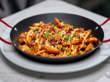 Crispy sweet potato fries, loaded with diced crispy bacons, shredded cheese, spicy aioli, and scallions. (Already Gluten Free)