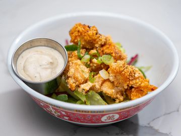 Spice Level: 1/3. Crispy popcorn chicken (chicken breast), tossed together with mixed spicy seasoning, served with garlic aioli on the side. (Already Gluten Free)