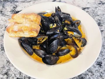 Spice Level: 1/3. Fresh mussels simmered in a fragrant coconut broth infused with red curry, served with toasted bread.